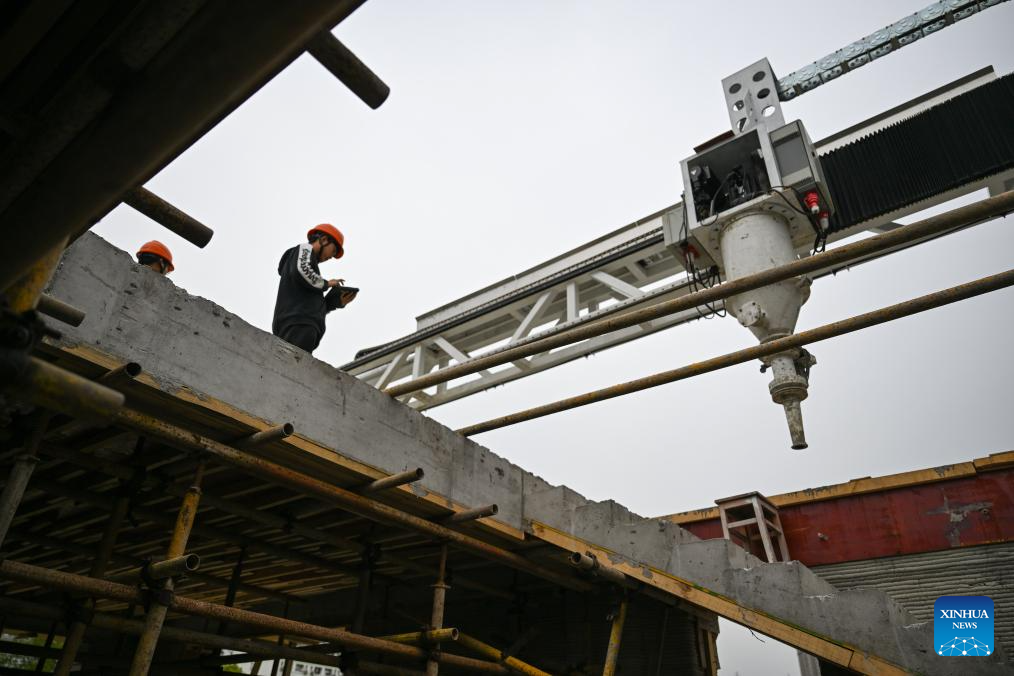 A constructor adjusts a piece of 3D printing equipment in Yichang, central China's Hubei Province, April 9, 2025. An 8-meter-tall and two-story building has completed its main structure in just 22 days during an architectural experiment conducted by a research team from China Three Gorges University. A house-building machine using 3D printing technology was used in the construction of the 100-square-meter experimental building. (Xinhua/Du Zixuan)