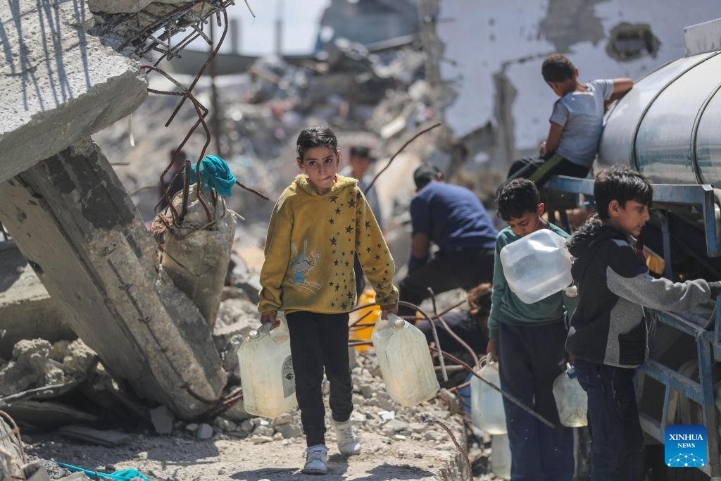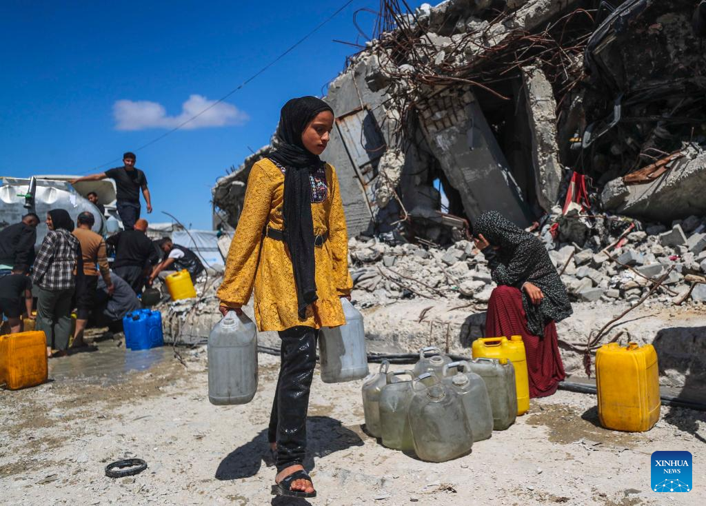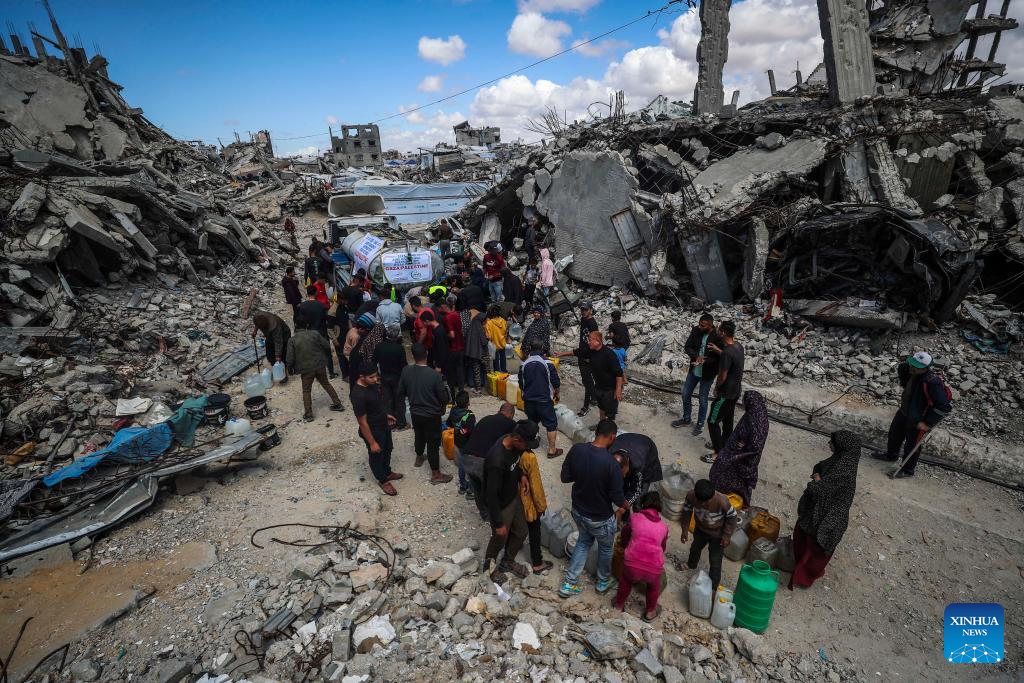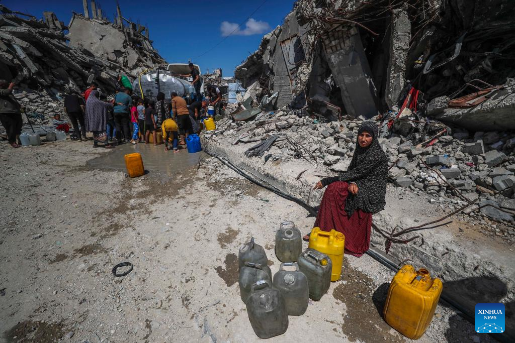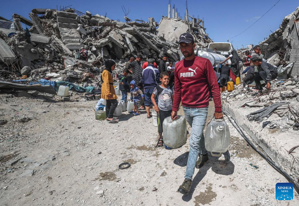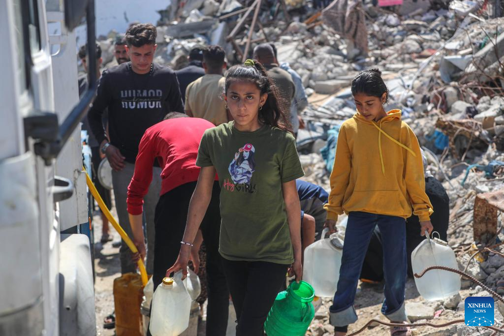 Displaced Palestinians fetch water in Jabalia refugee camp in the northern Gaza Strip, on April 10, 2025. Across Gaza, the UN Office for the Coordination of Humanitarian Affairs (OCHA) said its partners are warning of acute water shortages in shelters hosting displaced people. The loss of water, the lack of cleaning supplies and cohabitation with livestock are having a dire public health impact. In March, more than one-third of households in Gaza experienced lice infestations. (Photo by Mahmoud Zaki/Xinhua)