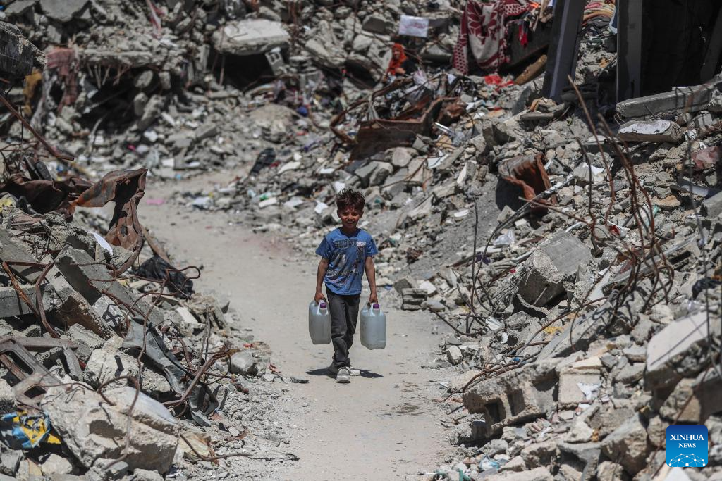 A displaced Palestinian boy fetches water in Jabalia refugee camp in the northern Gaza Strip, on April 10, 2025. Across Gaza, the UN Office for the Coordination of Humanitarian Affairs (OCHA) said its partners are warning of acute water shortages in shelters hosting displaced people. The loss of water, the lack of cleaning supplies and cohabitation with livestock are having a dire public health impact. In March, more than one-third of households in Gaza experienced lice infestations. (Photo by Mahmoud Zaki/Xinhua)