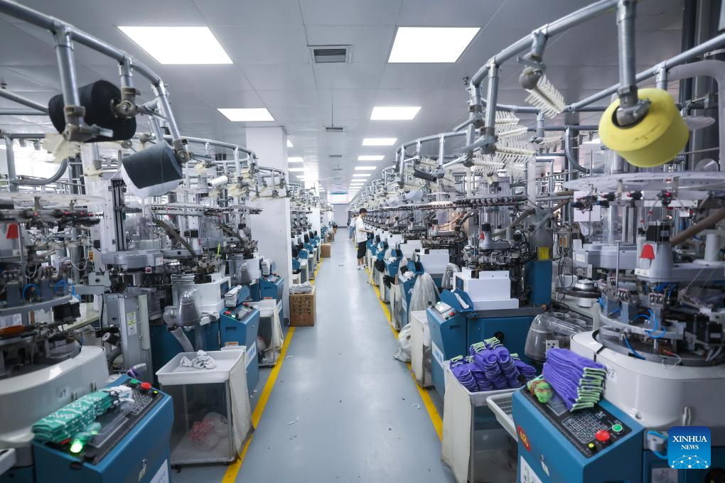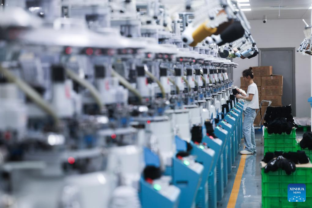 A worker is seen busy at the workshop of Baoge, a hosiery manufacturing enterprise, in Zhuji City, east China's Zhejiang Province on April 10, 2025. (Xinhua/Xu Yu)