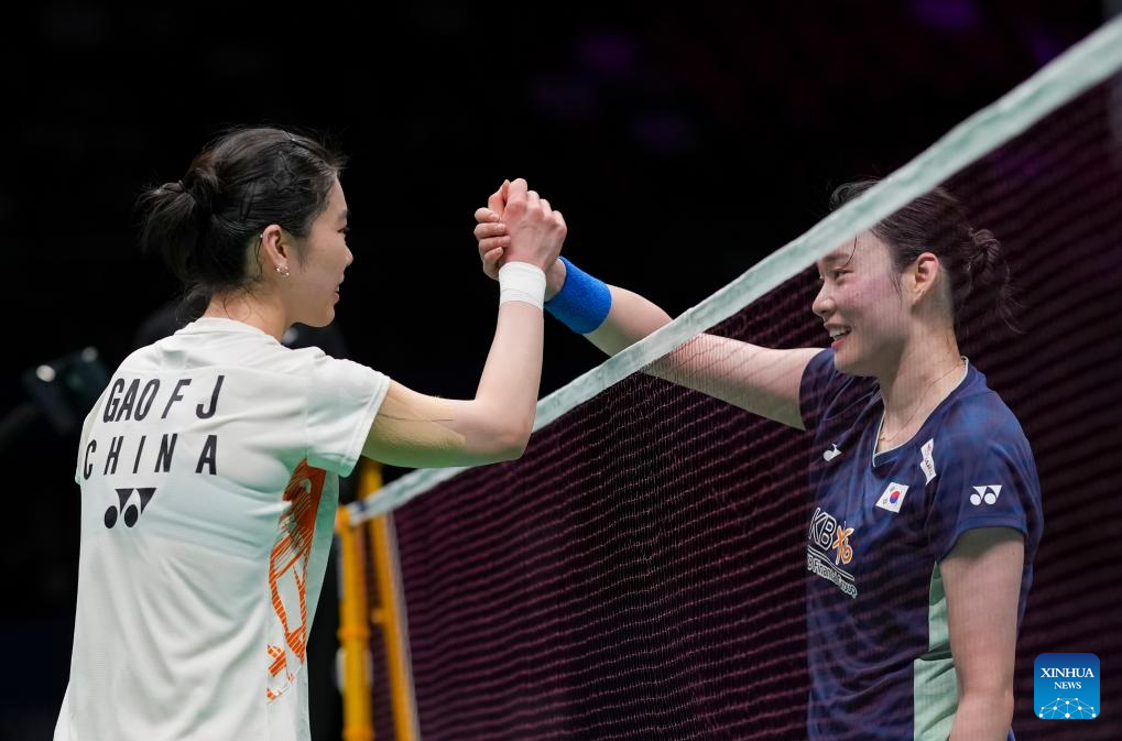 Gao Fangjie (L) of China shakes hands with Kim Ga Eun of South Korea after their women's singles quarterfinal match at Badminton Asia Championships 2025 in Ningbo, east China's Zhejiang Province, April 11, 2025. (Xinhua/Sun Fei)