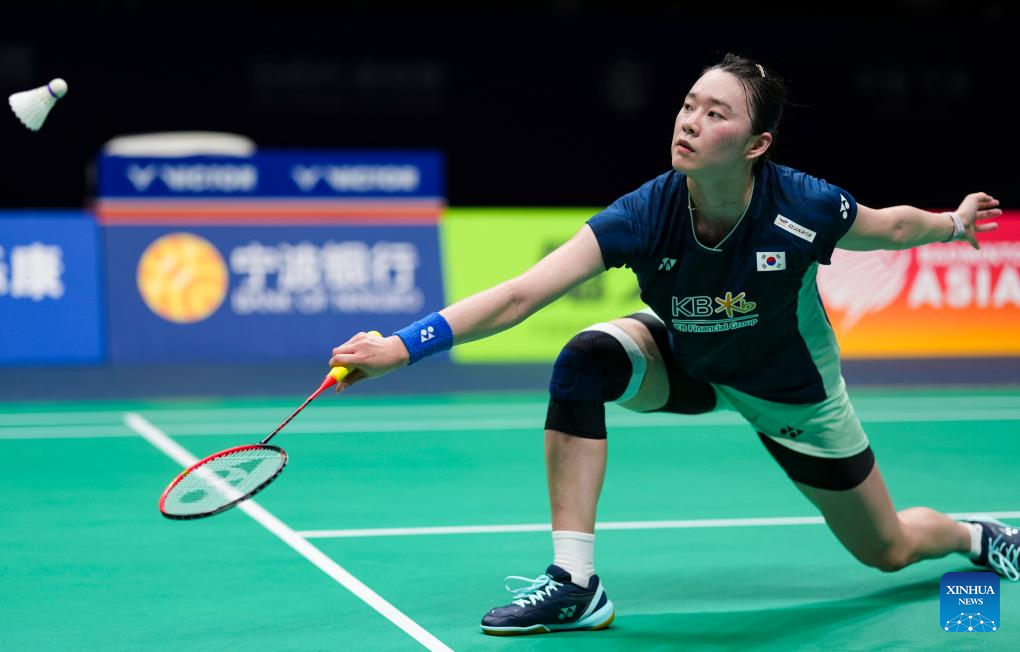 Kim Ga Eun of South Korea hits a return during the women's singles quarterfinal match against Gao Fangjie of China at Badminton Asia Championships 2025 in Ningbo, east China's Zhejiang Province, April 11, 2025. (Xinhua/Sun Fei)