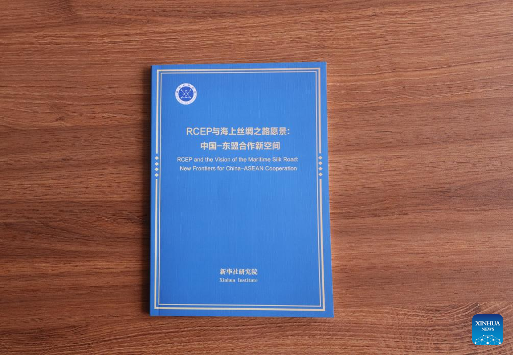 This photo taken on April 8, 2025 shows a report titled "RCEP and the Vision of the Maritime Silk Road: New Frontiers for China-ASEAN Cooperation." The report was released Friday by Xinhua Institute, the think tank of Xinhua News Agency, at the China-ASEAN Media and Think Tank Forum in Kuala Lumpur. (Xinhua/Yin Gang)