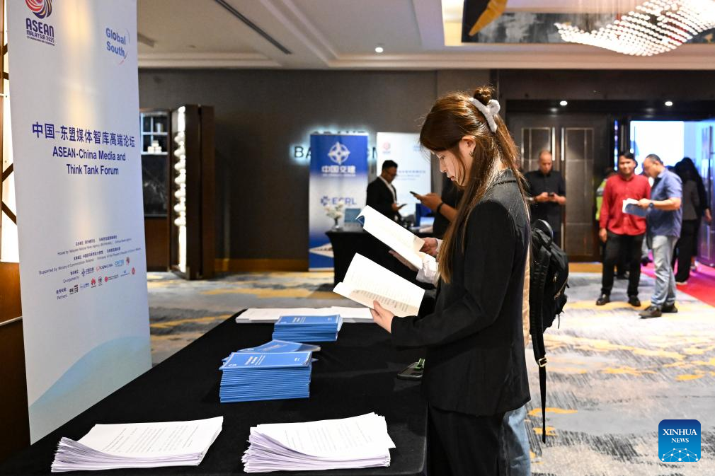 An attendee of the China-ASEAN Media and Think Tank Forum reads a report titled "RCEP and the Vision of the Maritime Silk Road: New Frontiers for China-ASEAN Cooperation" in Kuala Lumpur, Malaysia, April 11, 2025. The report was released Friday by Xinhua Institute, the think tank of Xinhua News Agency, at the China-ASEAN Media and Think Tank Forum in Kuala Lumpur. (Xinhua/Cheng Yiheng)