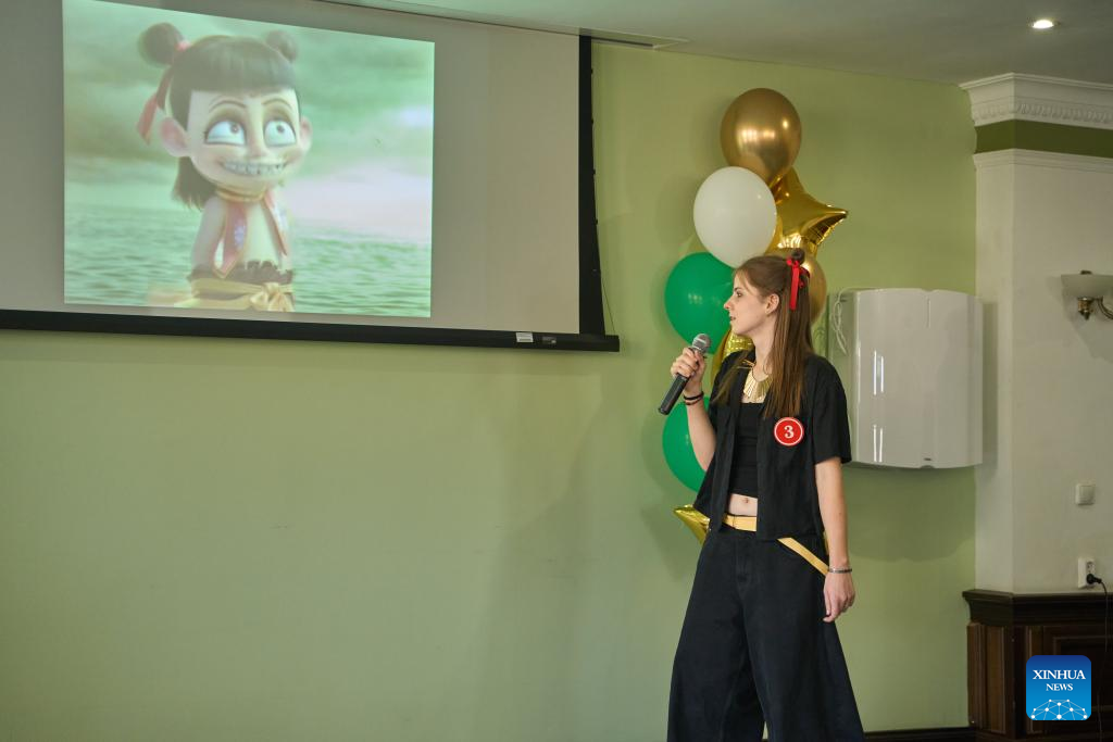 A contestant dubs a scene from the Chinese cartoon movie Ne Zha 2 during the preliminary round of the 24th "Chinese Bridge" Chinese Proficiency Competition for Foreign College Students held in Vladivostok, Russia, on April 10, 2025. Covering various dimensions including Chinese history, geography, literature and arts, the competition featured three main sections: themed speeches, a quiz and impromptu speeches, and talent performances.