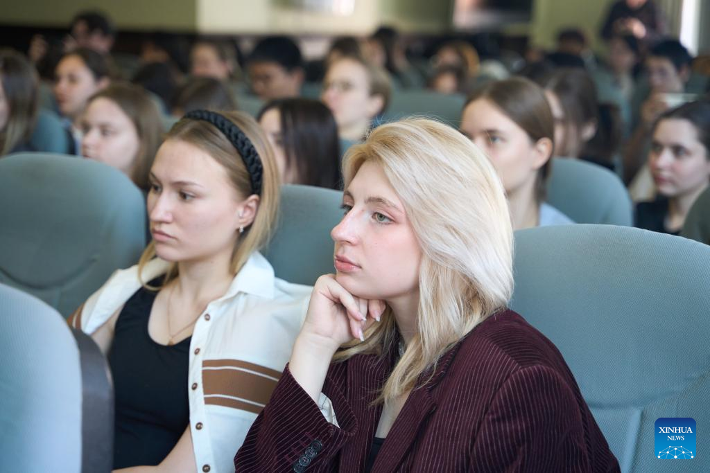 Russian college students watch the contest during the preliminary round of the 24th "Chinese Bridge" Chinese Proficiency Competition for Foreign College Students held in Vladivostok, Russia, on April 10, 2025. Covering various dimensions including Chinese history, geography, literature and arts, the competition featured three main sections: themed speeches, a quiz and impromptu speeches, and talent performances.