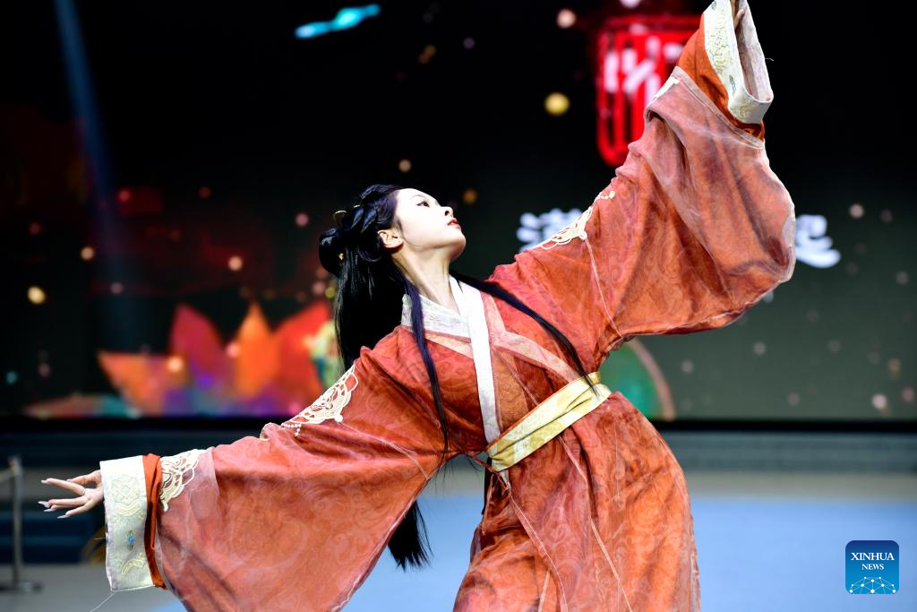Models present Hanfu on the stage during a Hanfu launch event in Caoxian County, east China's Shandong Province, April 10, 2025.