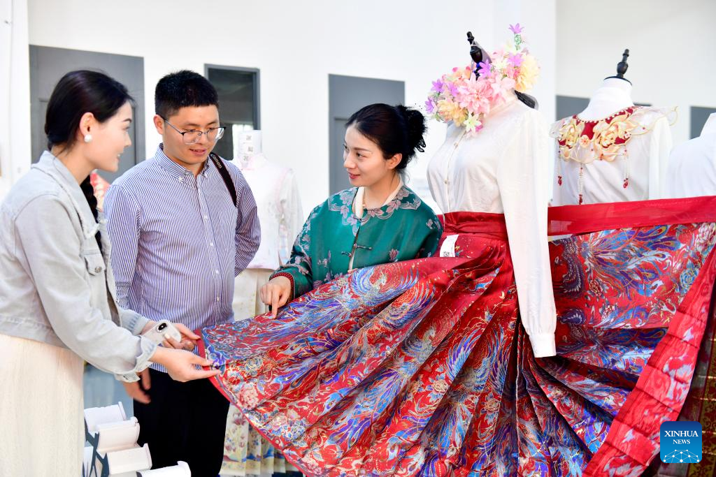 A staff member introduces Mamianqun, or horse-face skirt, a long, pleated traditional Chinese skirt, to visitors at a Hanfu base in Caoxian County, east China's Shandong Province, April 10, 2025. (Xinhua/Guo Xulei)