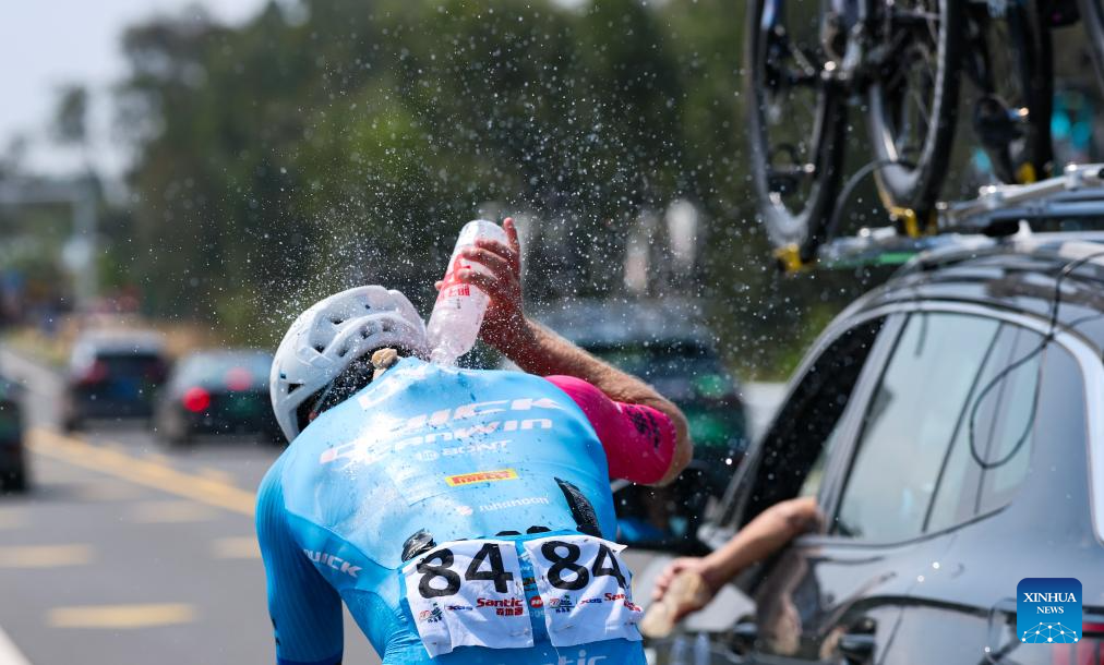 Karl Patrick Lauk of Quick Pro Team cools himself down during Stage 5 at the 16th Tour of Hainan cycling race from Dongfang to Sanya, south China's Hainan Province, April 11, 2025. (Xinhua/Yang Guanyu)
