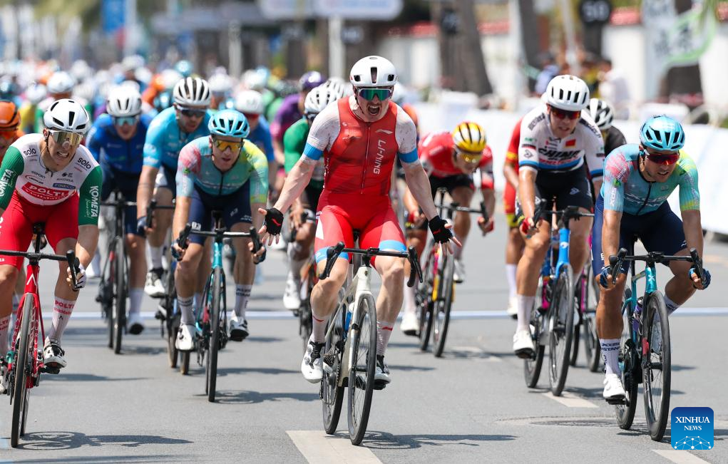 Alexander Salby of Li Ning Star celebrates winning Stage 5 at the 16th Tour of Hainan cycling race from Dongfang to Sanya, south China's Hainan Province, April 11, 2025. (Xinhua/Yang Guanyu)