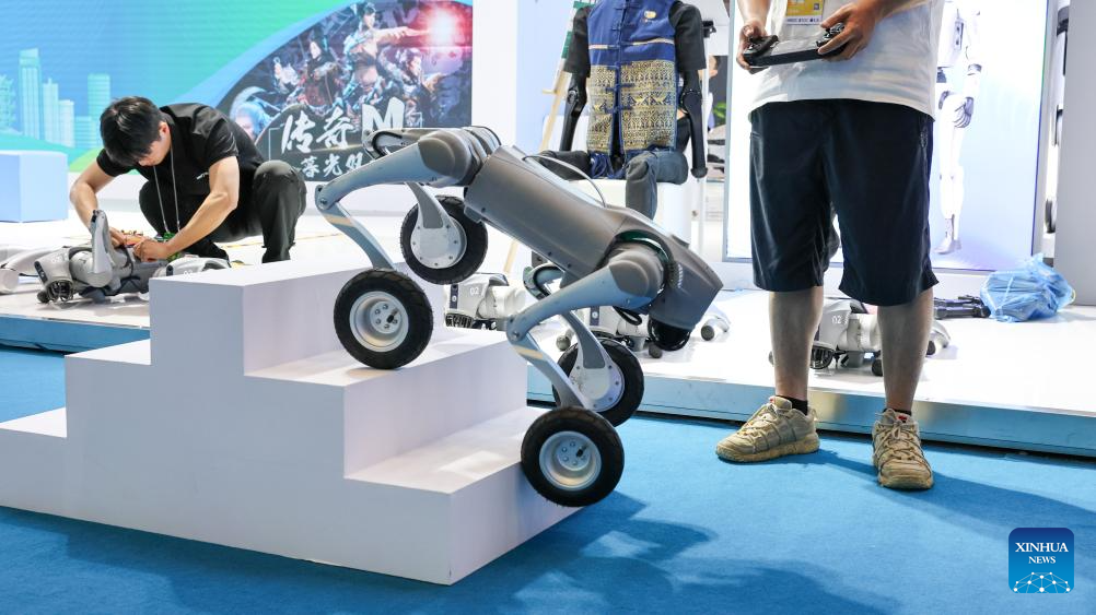 A robot dog displayed by Unitree Robotics is seen climbing steps at the 5th China International Consumer Products Expo (CICPE) in Haikou, south China's Hainan Province, April 13, 2025. The 5th CICPE runs from April 13 to 18 in south China's island province of Hainan.