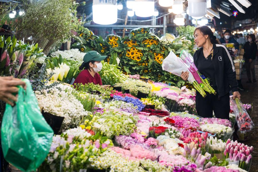 KUNMING/HANOI, April 13 (Xinhua) -- Nguyen Thuy Van, a florist from Lao Cai province in Vietnam, has been engaged in the flower industry for 14 years. She has been selling Yunnan flowers to Vietnam since 2018. Nowadays, upon the development of online sales platforms, both purchasing and logistics can be done online. Through the convenient logistics network, roses, lilies and other main varieties of flowers can arrive from the fields in China's Yunnan Province to the flower markets in Hanoi in the next day.