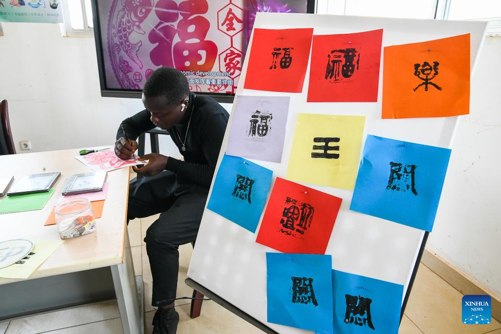 Local students and Chinese language enthusiasts experience Chinese paper cutting at the Confucius Institute at the University of Yaounde II in Soa, Cameroon, April 12, 2025.
