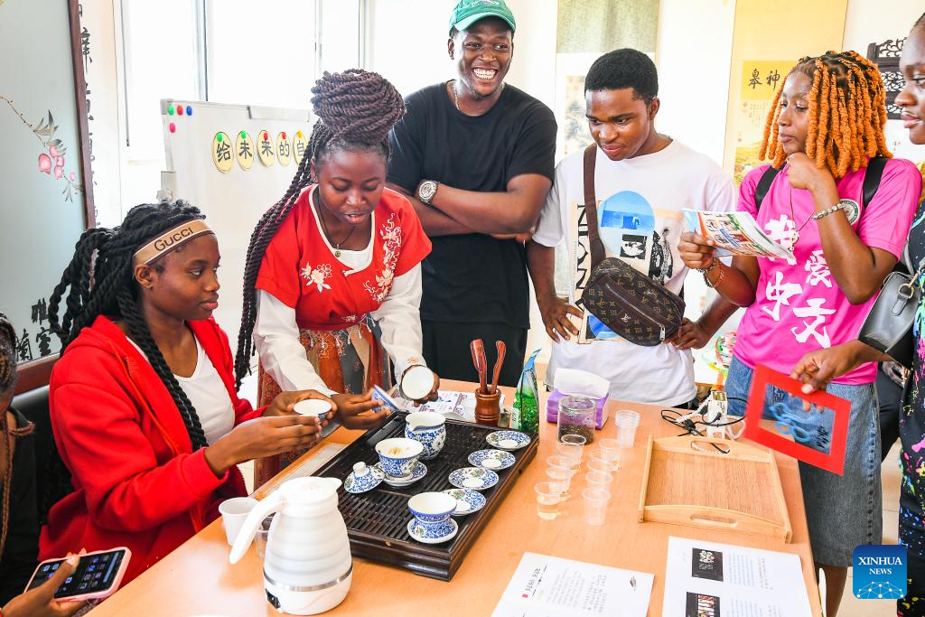 Local students and Chinese language enthusiasts experience Chinese tea art at the Confucius Institute at the University of Yaounde II in Soa, Cameroon, April 12, 2025.
