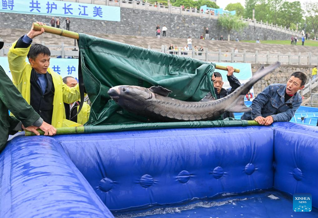 This photo taken on April 12, 2025 shows an activity to release Chinese sturgeons into the Yangtze River in Yichang City, central China's Hubei Province. More than 20,000 second-generation Chinese sturgeons were released into the Yangtze River during a release activity here on Saturday. (Xinhua/Du Zixuan)