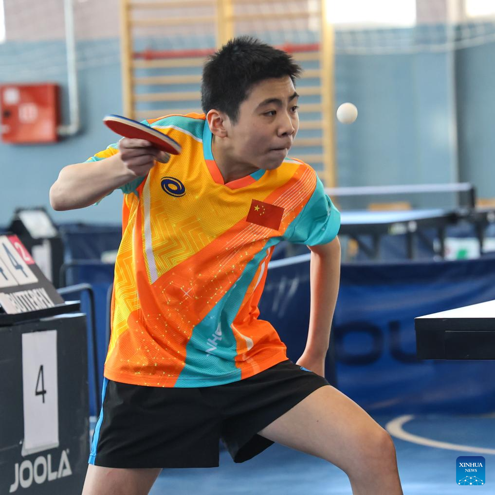 Zheng Quanyu of China competes against Cheng Min-Hsiu of Chinese Taipei during their table tennis Boys' individual final match at the ISF (International School Sport Federation) U15 Gymnasiade in Zlatibor, Serbia, April 12, 2025. (Photo by Predrag Milosavljevic/Xinhua)