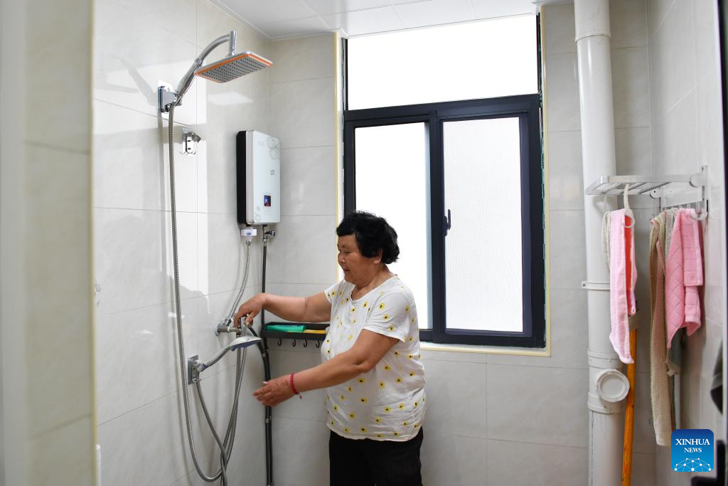 A resident adjusts a bathroom water heater at a resettlement site in Xingning Township, Zixing City, central China's Hunan Province, April 10, 2025. (Xinhua/Chen Zhenhai)