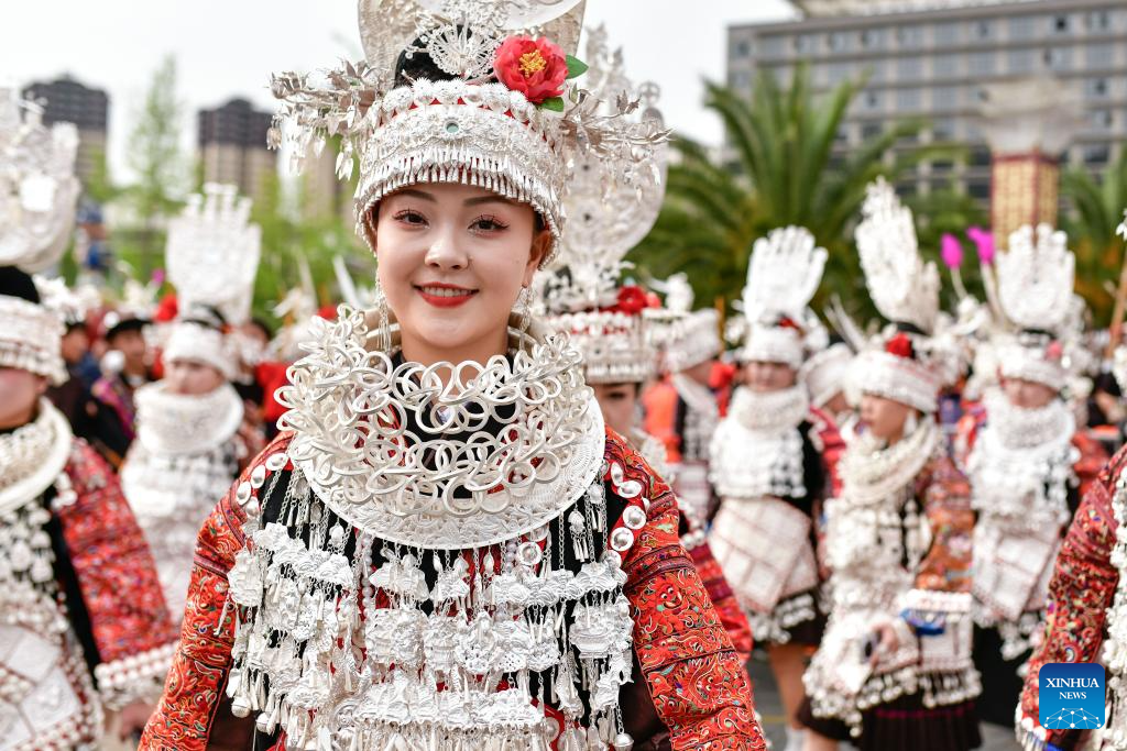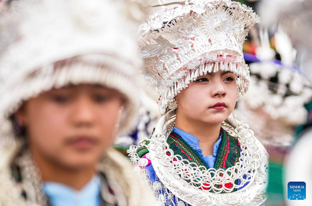 People in ethnic costumes attend an activity to celebrate the Miao Sisters Festival in Taijiang County, southwest China's Guizhou Province, April 12, 2025. Recognized as a national intangible cultural heritage, the Miao Sisters Festival was celebrated here on Saturday. (Xinhua/Yang Wenbin)