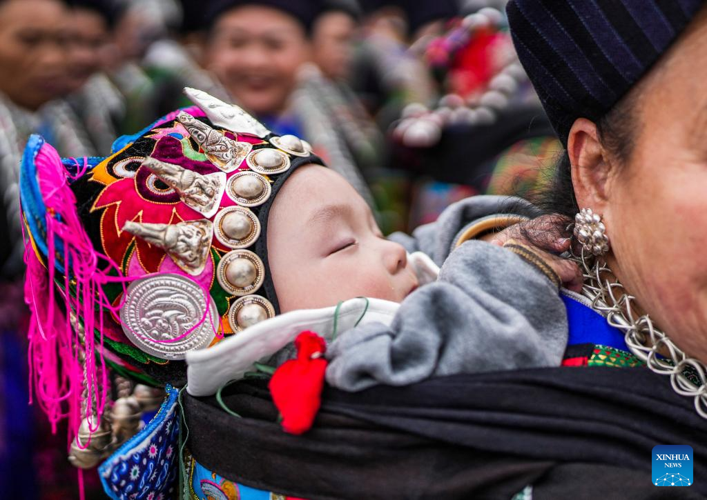 A child in ethnic costume is pictured during an activity in celebration of the Miao Sisters Festival in Taijiang County, southwest China's Guizhou Province, April 12, 2025. Recognized as a national intangible cultural heritage, the Miao Sisters Festival was celebrated here on Saturday. (Xinhua/Tao Liang)