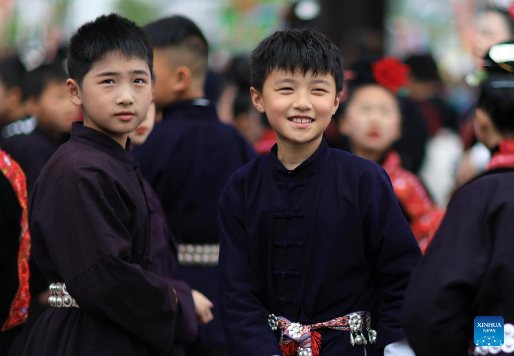 Children in ethnic costumes attend an activity to celebrate the Miao Sisters Festival in Taijiang County, southwest China's Guizhou Province, April 12, 2025. Recognized as a national intangible cultural heritage, the Miao Sisters Festival was celebrated here on Saturday. (Xinhua/Liu Xu)
