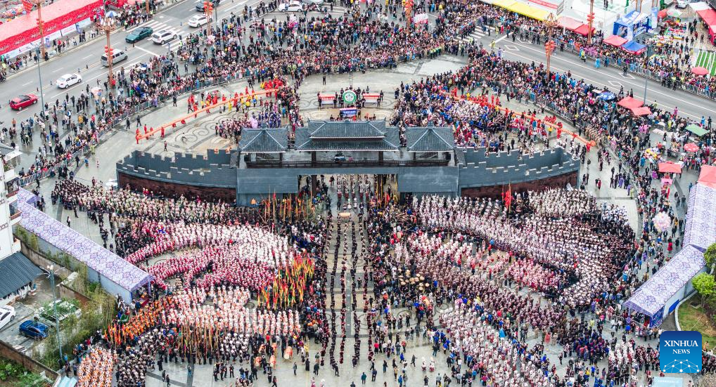 An aerial drone photo taken on April 12, 2025 shows people attending an activity to celebrate the Miao Sisters Festival in Taijiang County, southwest China's Guizhou Province. Recognized as a national intangible cultural heritage, the Miao Sisters Festival was celebrated here on Saturday. (Xinhua/Tao Liang)