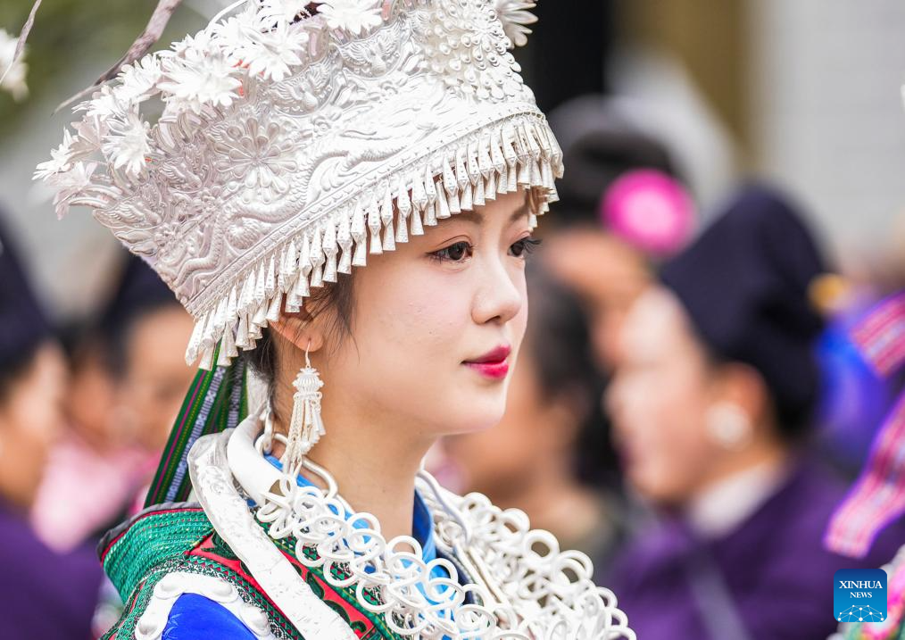 A woman in ethnic costume attends an activity to celebrate the Miao Sisters Festival in Taijiang County, southwest China's Guizhou Province, April 12, 2025. Recognized as a national intangible cultural heritage, the Miao Sisters Festival was celebrated here on Saturday. (Xinhua/Liu Xu)