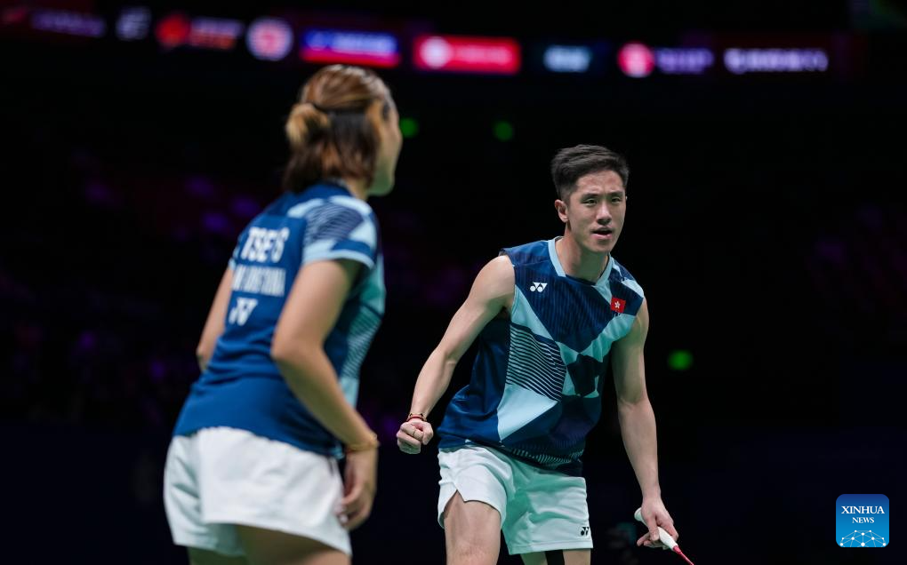 Tang Chun Man (R)/Tse Ying Suet of China's Hong Kong celebrate a score during the mixed doubles final match against Midorikawa Hiroki/Saito Natsu of Japan at Badminton Asia Championships 2025 in Ningbo, east China's Zhejiang Province, April 13, 2025. (Xinhua/Sun Fei)