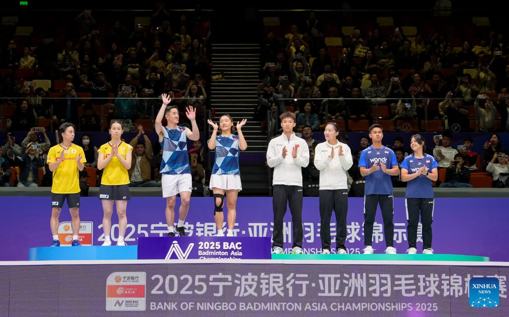 Gold medalists Tang Chun Man (3rd L)/Tse Ying Suet (4th L) of China's Hong Kong, silver medalists Midorikawa Hiroki (1st L)/Saito Natsu (2nd L) of Japan, bronze medalists Jiang Zhenbang (4th R)/Wei Yaxin (3rd R) of China and Jafar Hidayatullah (2nd R)/Felisha Alberta Nathaniel Pasaribu of Indonesia attend the awarding ceremony for the mixed doubles event at Badminton Asia Championships 2025 in Ningbo, east China's Zhejiang Province, April 13, 2025. (Xinhua/Sun Fei)