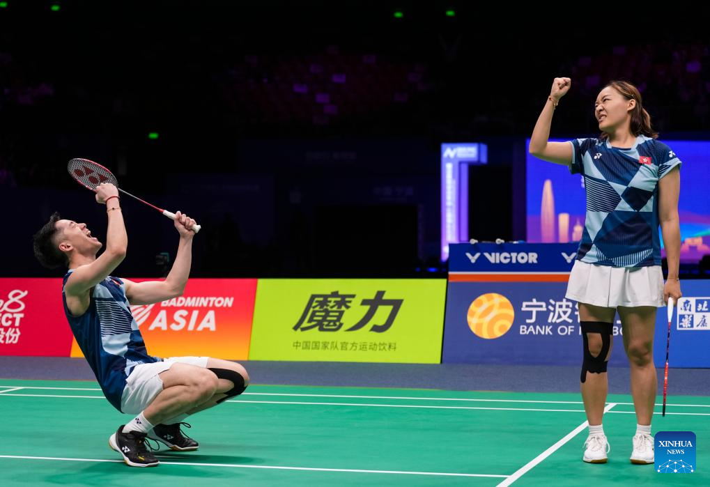 Tang Chun Man (L)/Tse Ying Suet of China's Hong Kong celebrate after winning the mixed doubles final match against Midorikawa Hiroki/Saito Natsu of Japan at Badminton Asia Championships 2025 in Ningbo, east China's Zhejiang Province, April 13, 2025. (Xinhua/Sun Fei)