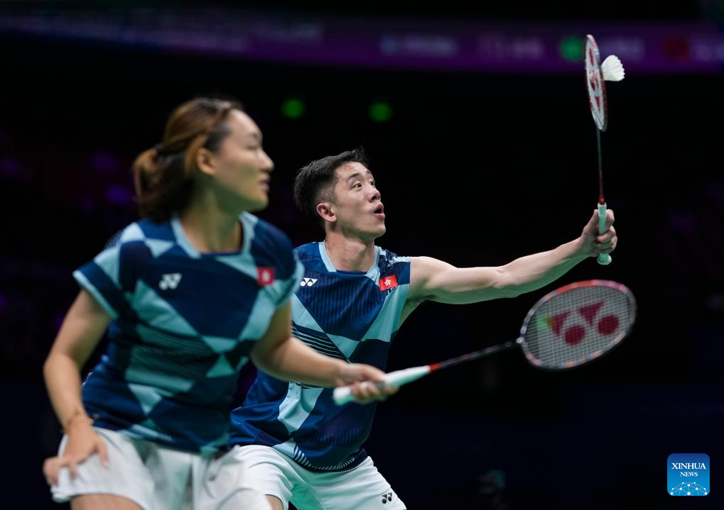 Tang Chun Man (L)/Tse Ying Suet of China's Hong Kong compete during the mixed doubles final match against Midorikawa Hiroki/Saito Natsu of Japan at Badminton Asia Championships 2025 in Ningbo, east China's Zhejiang Province, April 13, 2025. (Xinhua/Sun Fei)