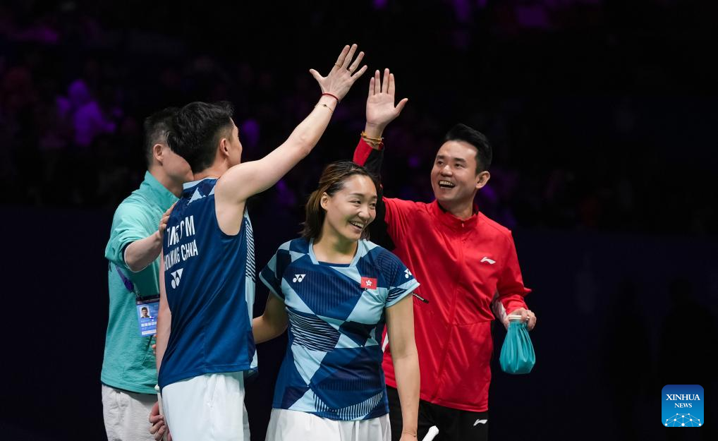 Tang Chun Man (2nd L)/Tse Ying Suet (2nd R) of China's Hong Kong celebrate with their coach Tan Bin Shen (1st R) after winning the mixed doubles final match against Midorikawa Hiroki/Saito Natsu of Japan at Badminton Asia Championships 2025 in Ningbo, east China's Zhejiang Province, April 13, 2025. (Xinhua/Sun Fei)