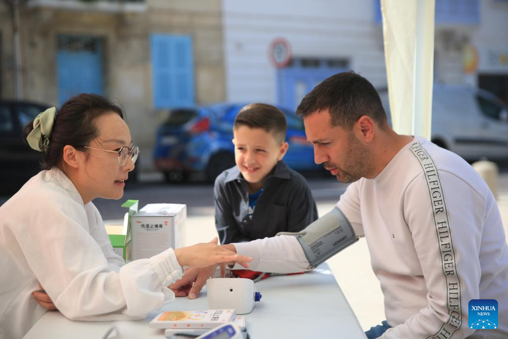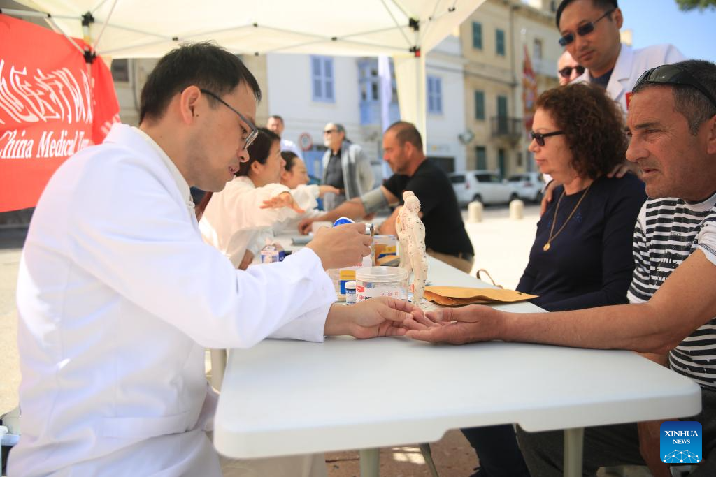 VALLETTA, April 13 (Xinhua) -- The 20th Chinese medical team for Malta from the Mediterranean Regional Centre for Traditional Chinese Medicine (MRCTCM) provided free clinical services to residents at the main square of Kalkara, southeastern Malta, on Sunday.