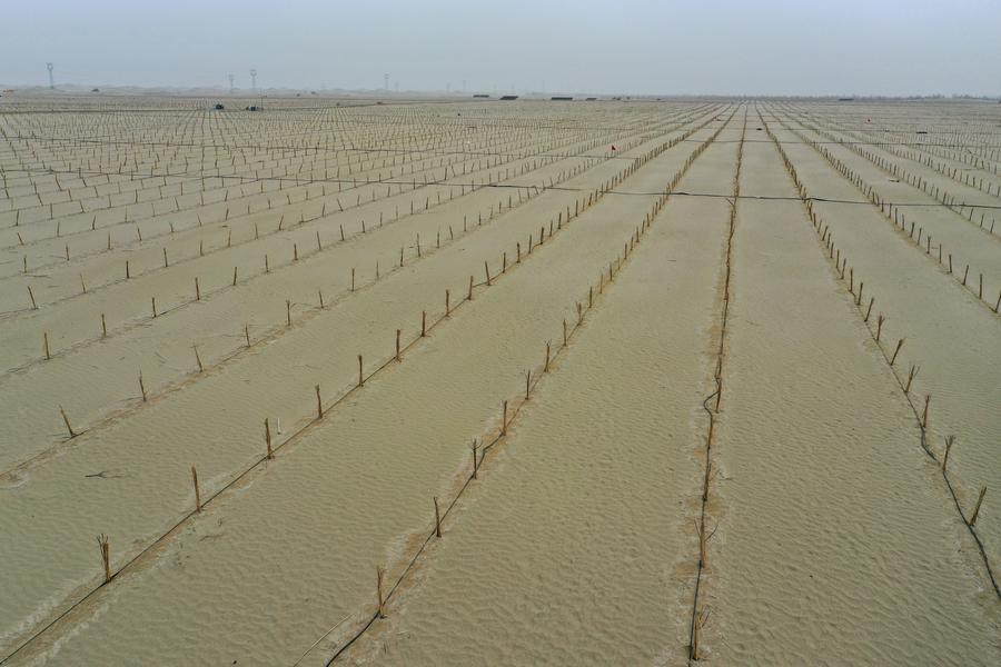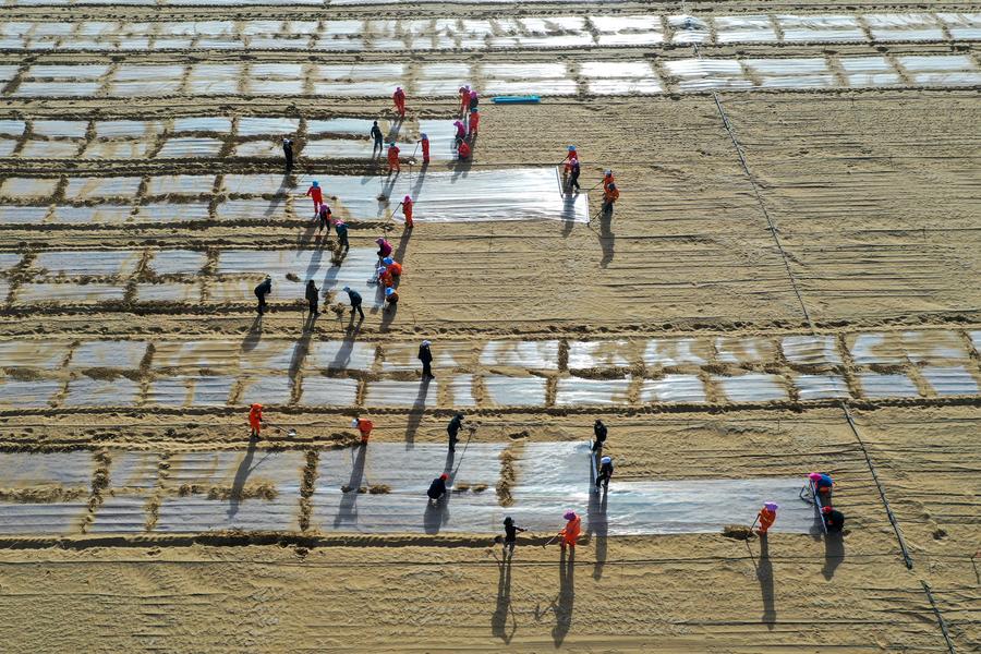 People arrange drip irrigation pipes at a sand-control experimental base in Yutian County of Hotan Prefecture, northwest China's Xinjiang Uygur Autonomous Region, April 8, 2025. (Xinhua/Ding Lei)