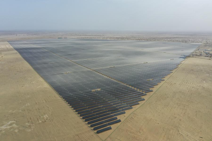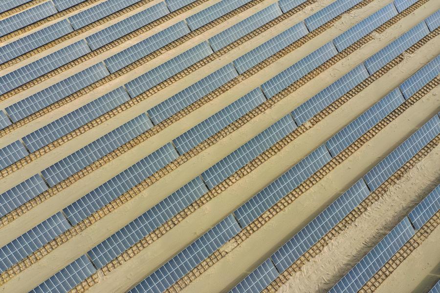 An aerial drone photo taken on April 13, 2025 shows a photovoltaic power project in Xayar County, Aksu Prefecture, northwest China's Xinjiang Uygur Autonomous Region. (Xinhua/Ding Lei)