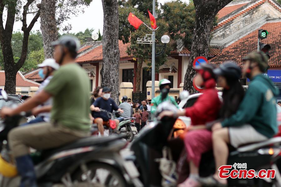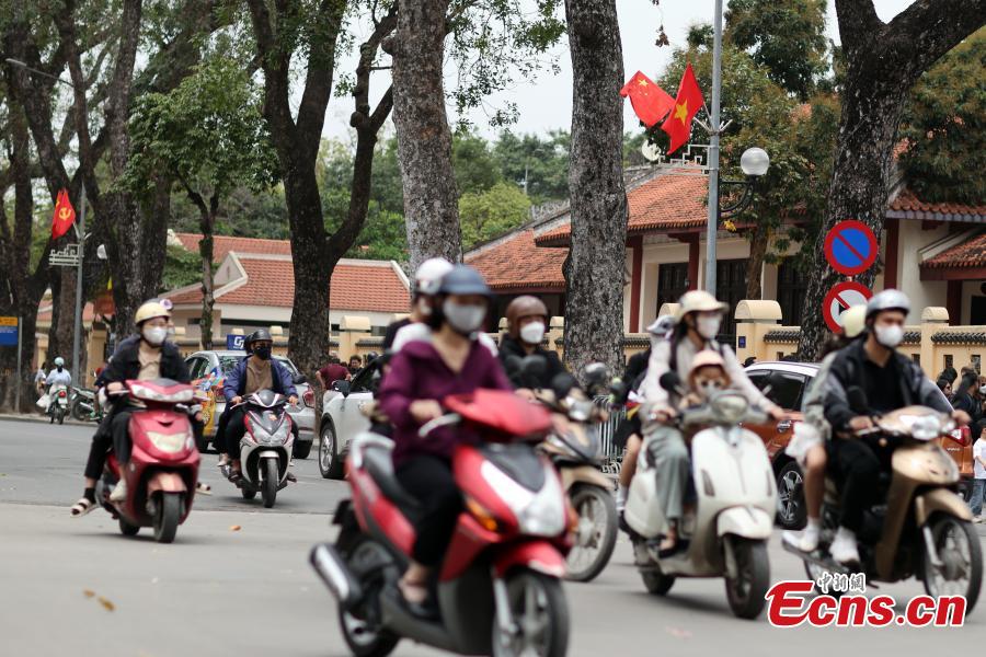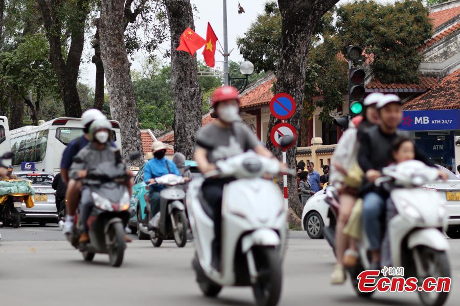 Chinese and Vietnamese national flags are hung along a street in Hanoi, Vietnam, April 13, 2025. (China News Service/Sheng Jiapeng)