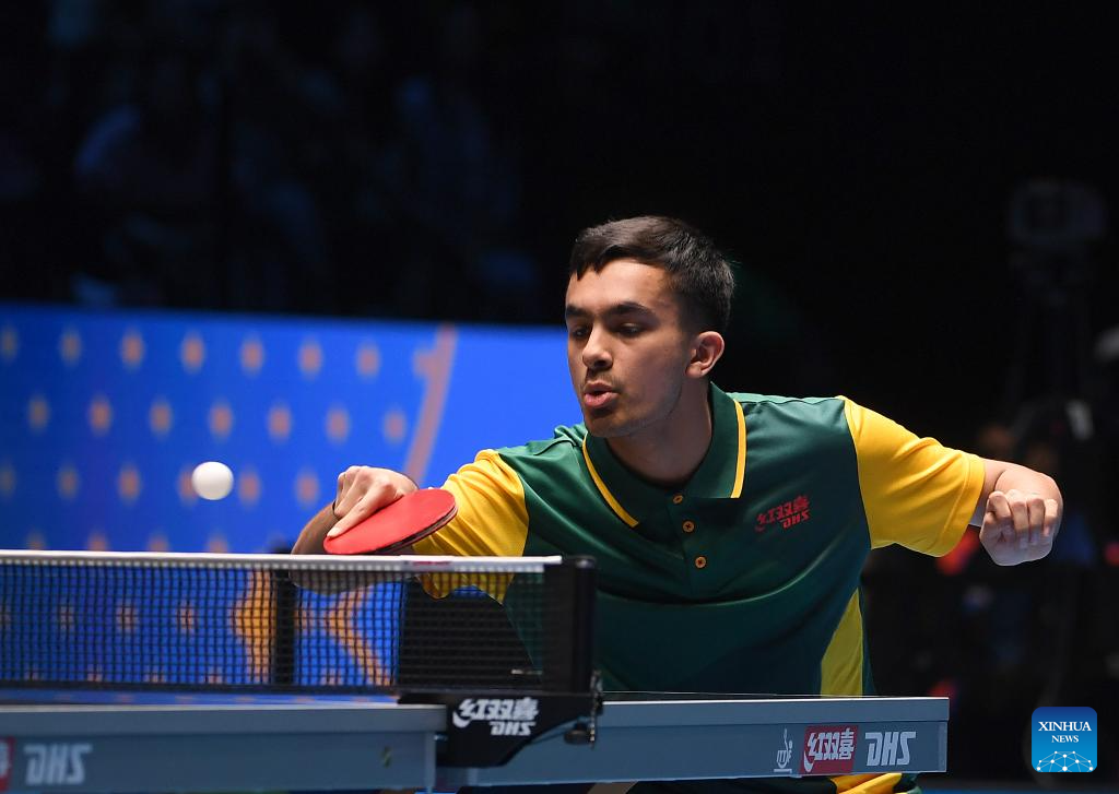 Aditya Sareen of Australia hits a return during the men's singles group match between Wang Chuqin of China and Aditya Sareen of Australia at the ITTF Men's and Women's World Cup 2025 in Macao, China, April 15, 2025. (Xinhua/Chen Duo)
