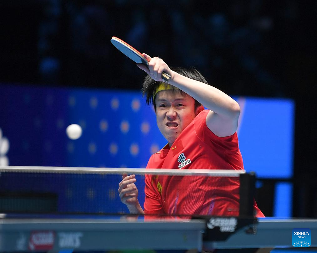 Wang Chuqin of China hits a return during the men's singles group match between Wang Chuqin of China and Aditya Sareen of Australia at the ITTF Men's and Women's World Cup 2025 in Macao, China, April 15, 2025. (Xinhua/Chen Duo)