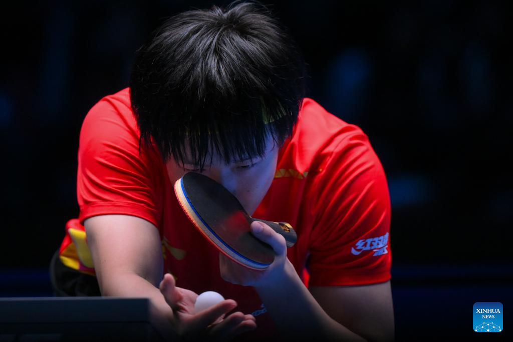 Wang Chuqin of China reacts during the men's singles group match between Wang Chuqin of China and Aditya Sareen of Australia at the ITTF Men's and Women's World Cup 2025 in Macao, China, April 15, 2025. (Photo by Cheong Kam Ka/Xinhua)