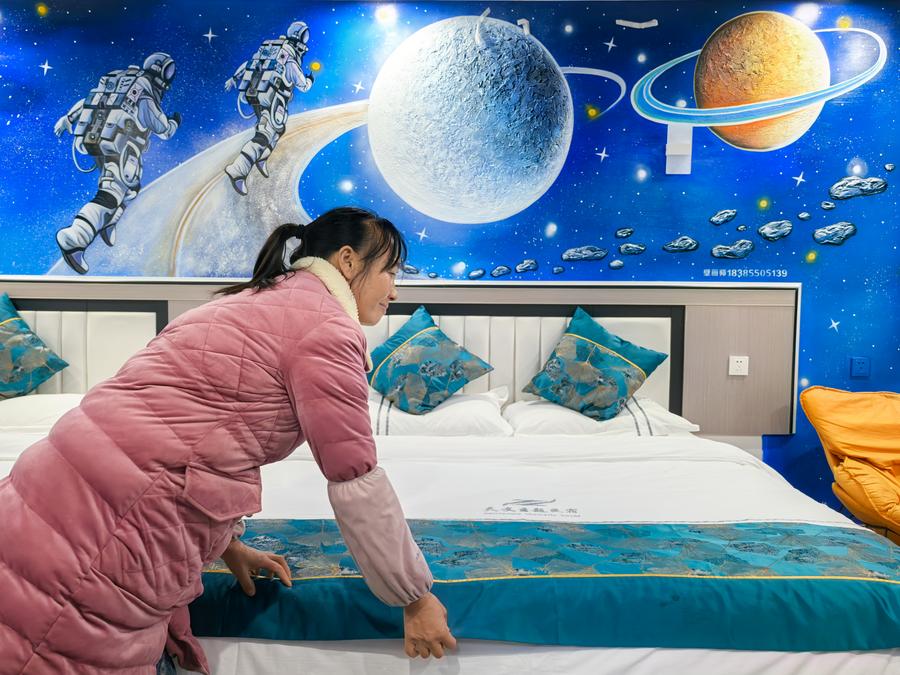A woman tidies up a room in a sci-fi style homestay in Kedu Town of Pingtang County, southwest China's Guizhou Province, on Feb. 19, 2025. (Xinhua/Liu Xu)