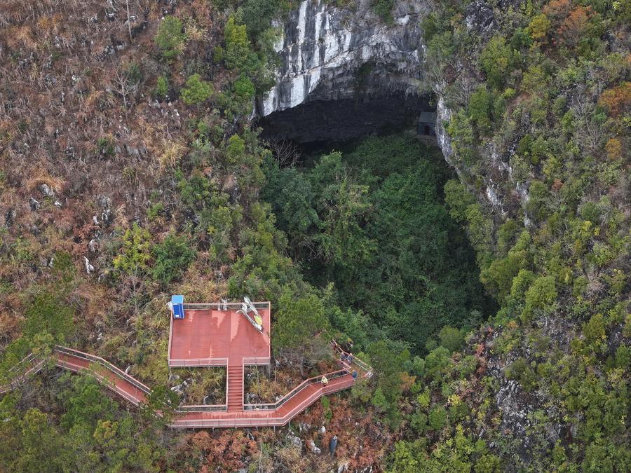Tourists visit a natural depression in Pingtang County, southwest China's Guizhou Province, on Feb. 19, 2025. (Xinhua/Ou Dongqu)