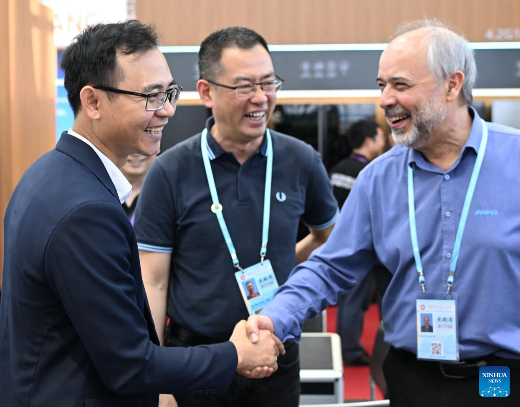 Huynh Ngoc Hoa (L) shakes hands with a supplier at the 137th edition of the China Import and Export Fair, also known as the Canton Fair, in Guangzhou, south China's Guangdong Province, April 15, 2025. Huynh Ngoc Hoa is a vice manager of SANAKY, a home appliance enterprise in Vietnam. This year is the first time that his company has participated in the Canton Fair. Besides introducing products to customers, Huynh also visited Chinese exhibitors at the fair. He said that the Canton Fair has set up a good negotiation platform between exhibitors and buyers. His company will continue to participate in the Canton Fair in the future, making good use of this platform to expand its export business and understand new market trends.