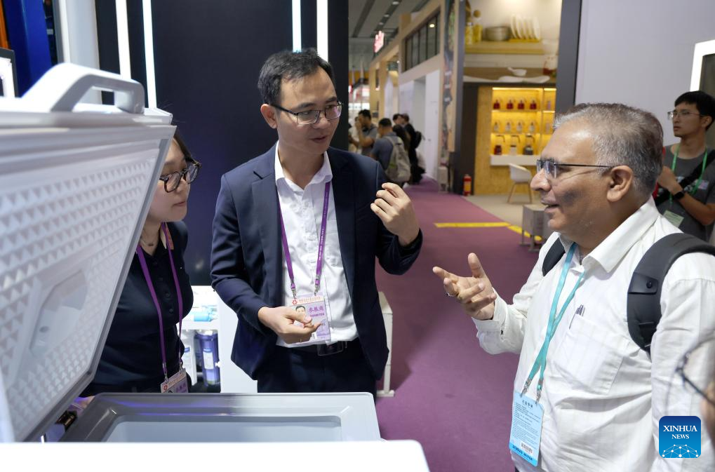Huynh Ngoc Hoa (C) introduces a refrigerator produced by his enterprise to a customer at the 137th edition of the China Import and Export Fair, also known as the Canton Fair, in Guangzhou, south China's Guangdong Province, April 15, 2025. (Xinhua/Lu Hanxin)