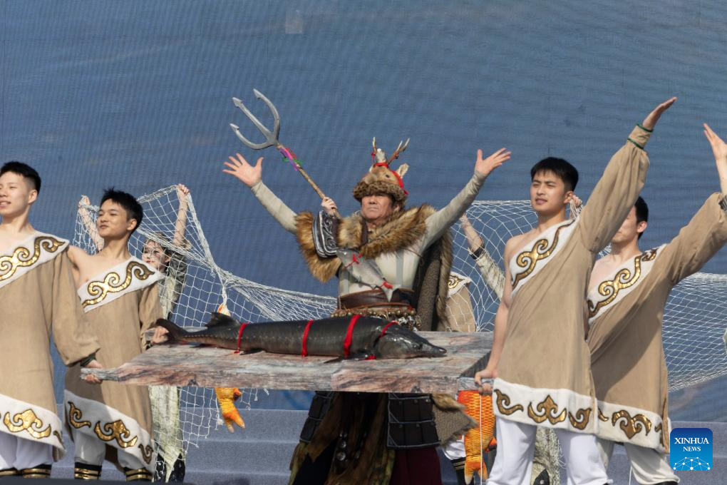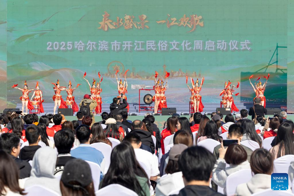 A performance is staged during the launching ceremony of a "Kaijiang" folk culture week in Harbin, northeast China's Heilongjiang Province, April 16, 2025. "Kaijiang" refers to the annual springtime thawing of ice-covered rivers in northeast China. As people in Harbin on Wednesday kicked off a folk culture week to celebrate the thawing of Songhua River, many activities such as rituals and traditional performances were held to showcase the region's ethnic heritage. (Xinhua/Zhang Tao)