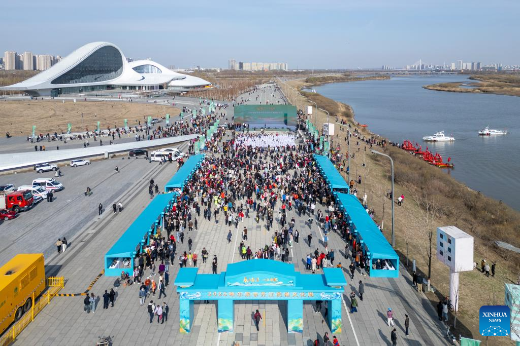 An aerial drone photo shows the launching ceremony of a "Kaijiang" folk culture week in Harbin, northeast China's Heilongjiang Province, April 16, 2025. "Kaijiang" refers to the annual springtime thawing of ice-covered rivers in northeast China. As people in Harbin on Wednesday kicked off a folk culture week to celebrate the thawing of Songhua River, many activities such as rituals and traditional performances were held to showcase the region's ethnic heritage. (Xinhua/Zhang Tao)