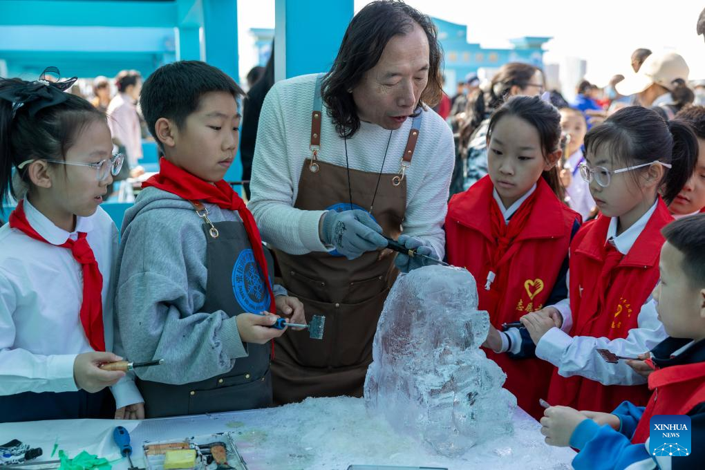 An ice sculptor displays ice carving skills during the launching ceremony of a "Kaijiang" folk culture week in Harbin, northeast China's Heilongjiang Province, April 16, 2025. "Kaijiang" refers to the annual springtime thawing of ice-covered rivers in northeast China. As people in Harbin on Wednesday kicked off a folk culture week to celebrate the thawing of Songhua River, many activities such as rituals and traditional performances were held to showcase the region's ethnic heritage. (Xinhua/Zhang Tao)