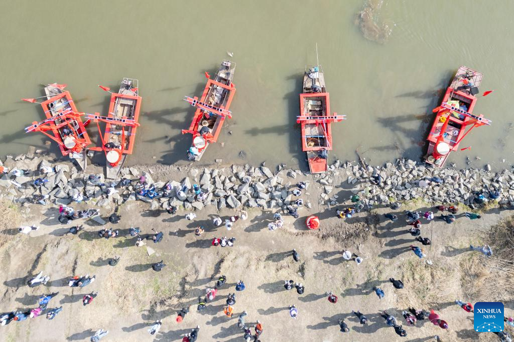 An aerial drone photo shows fishing vessels during the launching ceremony of a "Kaijiang" folk culture week in Harbin, northeast China's Heilongjiang Province, April 16, 2025. "Kaijiang" refers to the annual springtime thawing of ice-covered rivers in northeast China. As people in Harbin on Wednesday kicked off a folk culture week to celebrate the thawing of Songhua River, many activities such as rituals and traditional performances were held to showcase the region's ethnic heritage. (Xinhua/Zhang Tao)