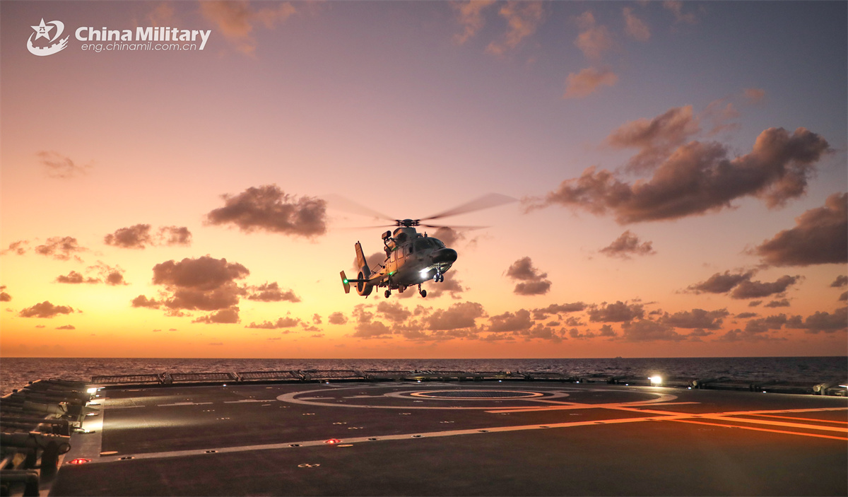 A ship-borne helicopter attached to the 47th Chinese naval escort taskforce lifts off from a naval ship during a multi-subject training exercise in the Gulf of Aden on April 2, 2025. (eng.chinamil.com.cn/Photo by Fan Zheng)