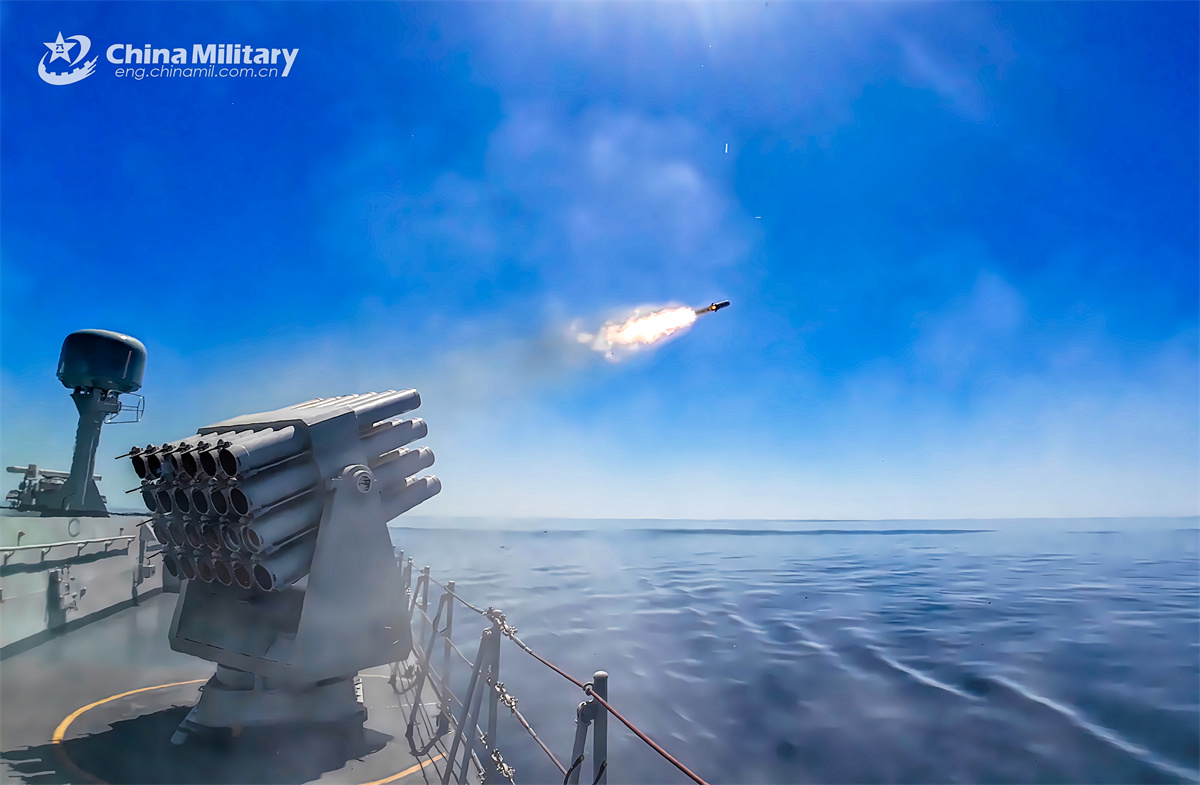 The guided-missile frigate Honghe (Hull 523) attached to the 47th Chinese naval escort taskforce fires jamming bombs during a multi-subject training exercise in the Gulf of Aden on April 2, 2025. (eng.chinamil.com.cn/Photo by Fan Zheng)