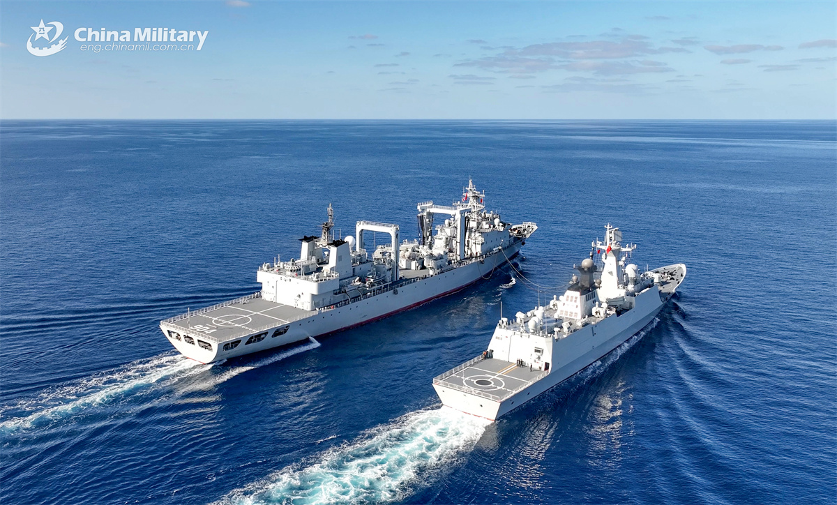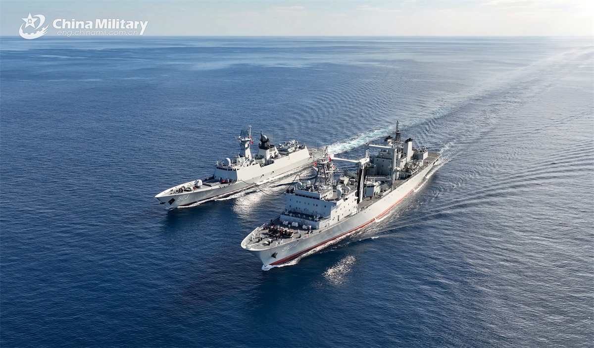 Comprehensive supply ship Gaoyouhu (Hull 904) and guided-missile frigate Honghe (Hull 523) attached to the 47th Chinese naval escort taskforce conduct alongside replenishment-at-sea during a multi-subject training exercise in the Gulf of Aden on April 2, 2025. (eng.chinamil.com.cn/Photo by Fan Zheng)