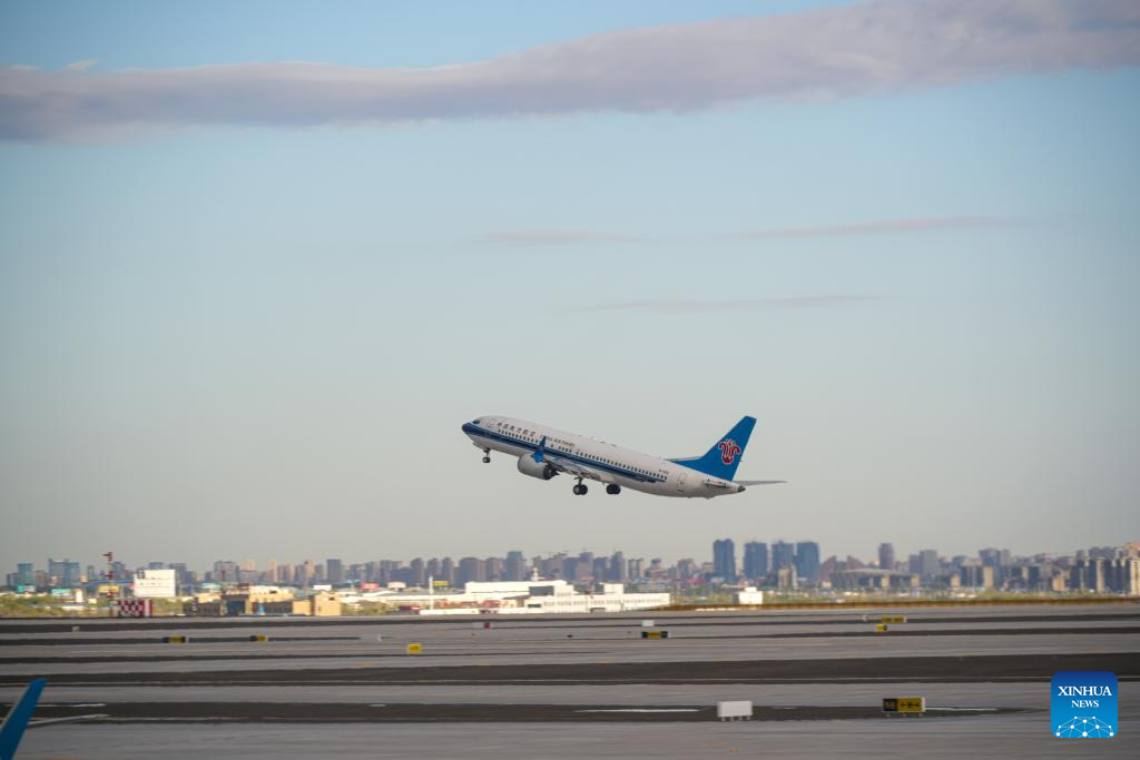 An airplane bound for Guangzhou of Guangdong Province takes off at Urumqi Tianshan International Airport in Urumqi, northwest China's Xinjiang Uygur Autonomous Region, April 17, 2025. A new terminal at Urumqi Tianshan International Airport in northwest China's Xinjiang Uygur Autonomous Region began trial operations on Thursday, marking a major step in expanding regional air capacity. (Xinhua/Xu Hongyan)